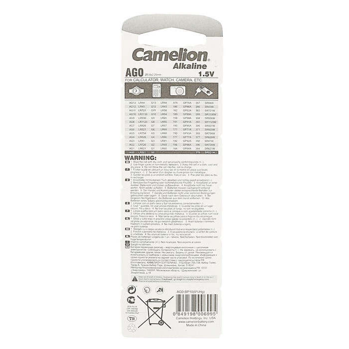 Батарейка алкалиновая Camelion Mercury Free, AG0 (LR521, 379)-10BL, 1.5В, блистер, 10 шт.