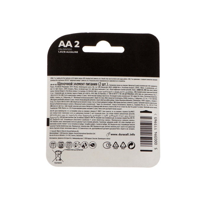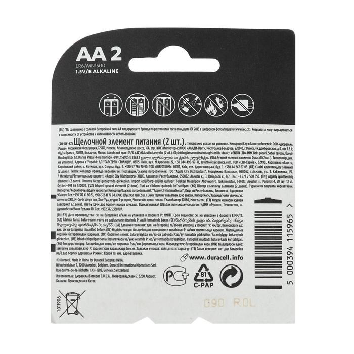 Батарейка алкалиновая Duracell Basic, AA, LR6-2BL, 1.5В, блистер, 2 шт.
