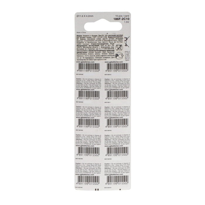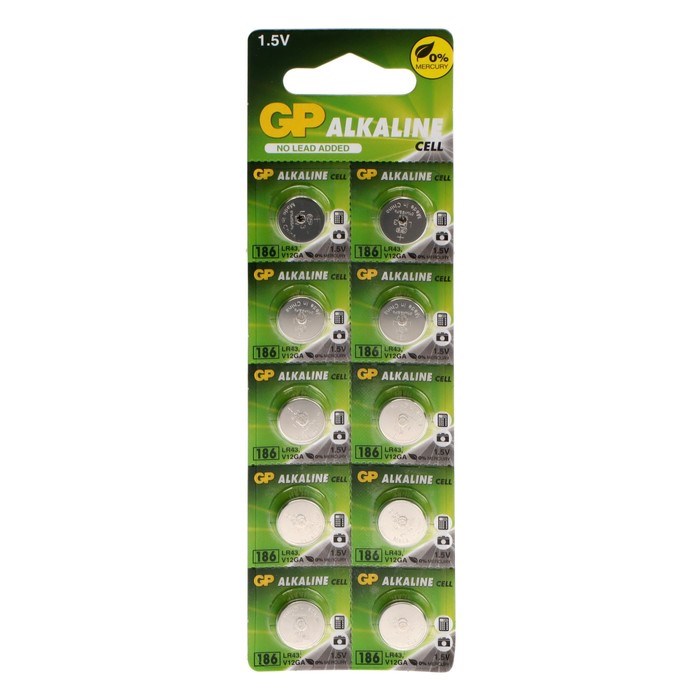 Батарейка алкалиновая GP, LR43 (G12, V12GA, 186)-10BL, 1.5В, блистер, 10 шт.