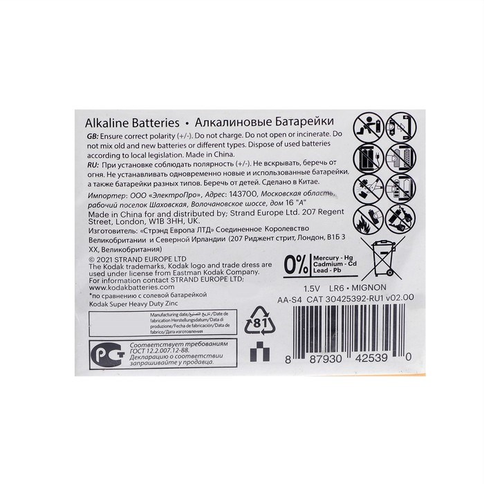 Батарейка алкалиновая Kodak Xtralife, AA, LR6-20BOX, 1.5 В, бокс, 20 шт.