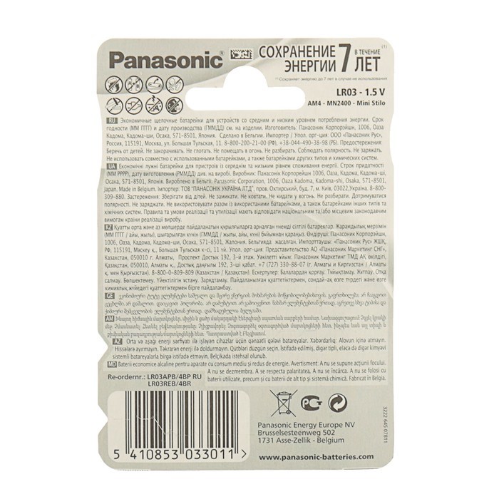 Батарейка алкалиновая Panasonic Alkaline Power, AAA, LR03-4BL, 1.5В, блистер, 4 шт.