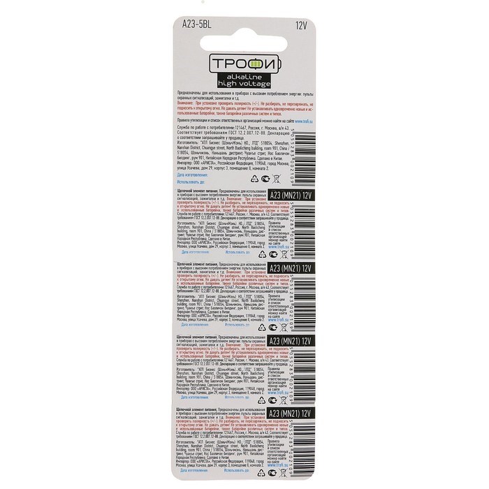 Батарейка алкалиновая "Трофи" Alkaline, А23 (MN21)-5BL, 12В, блистер, 5 шт.