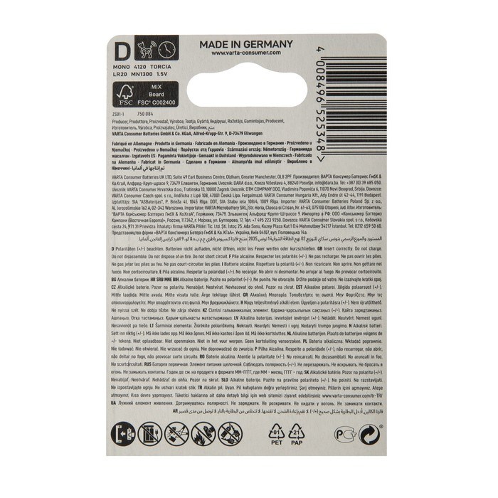 Батарейка алкалиновая Varta LONGLIFE D набор 2 шт