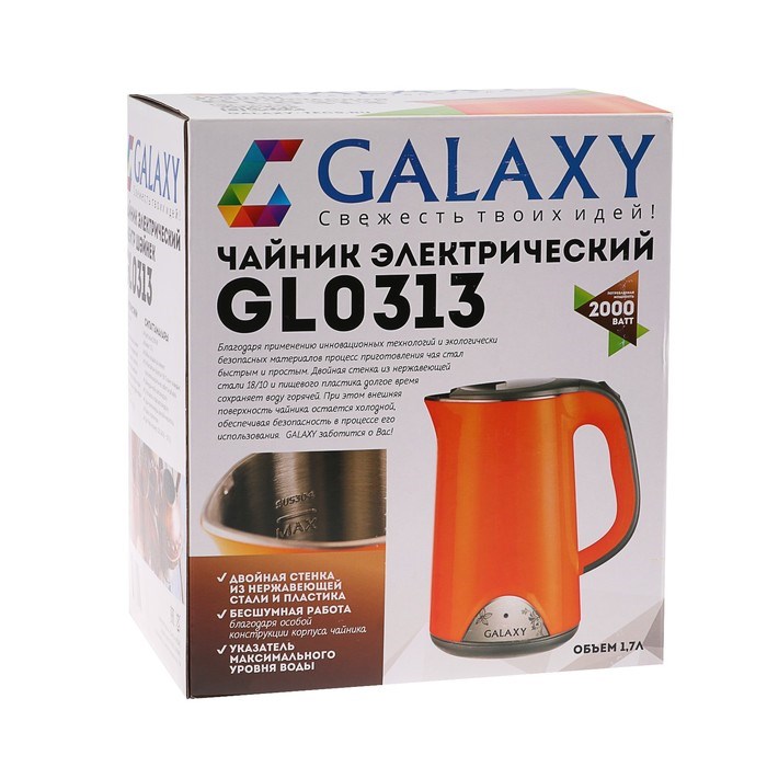 Электрический чайник Galaxy GL имеет отличный внешний вид и превосходные технические характеристики. Благодаря двойной стенке вода в чайнике надолго остаётся горячей.