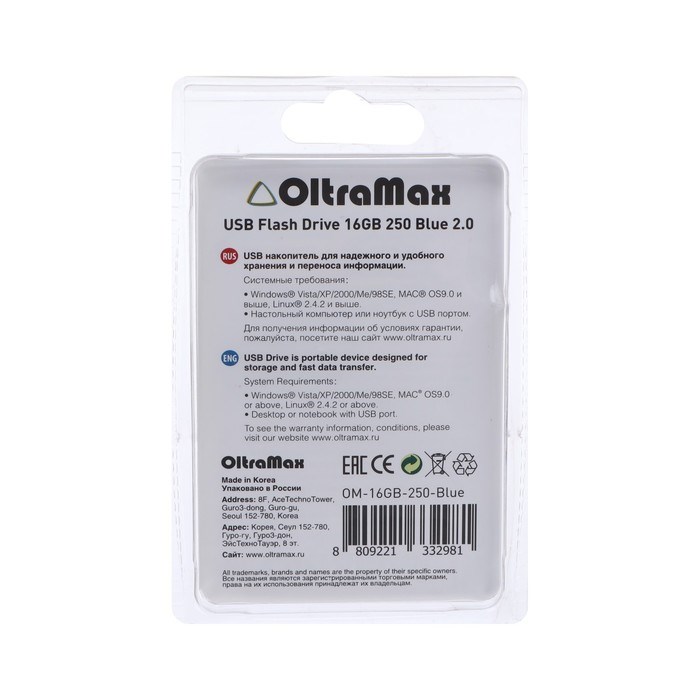 Флешка OltraMax 250, 16 Гб, USB2.0, чт до 15 Мб/с, зап до 8 Мб/с, синяя