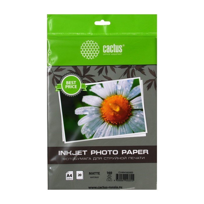 Фотобумага для струйной печати А4, 20 листов Cactus, 160 г/м2, односторонняя, матовая, в пакете