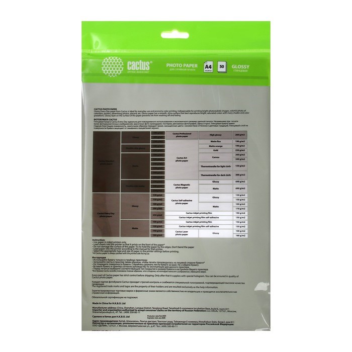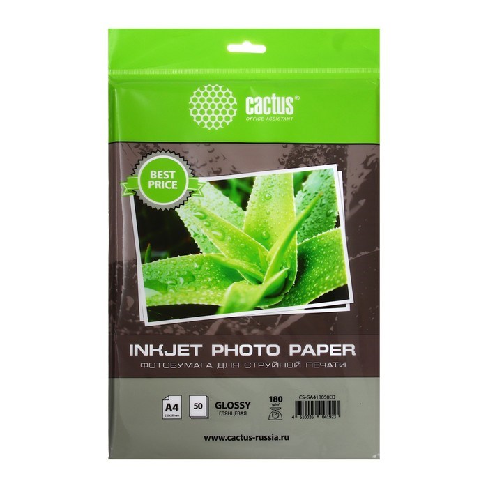 Фотобумага для струйной печати А4, 50 листов Cactus, 180 г/м2, односторонняя, глянцевая, в пакете