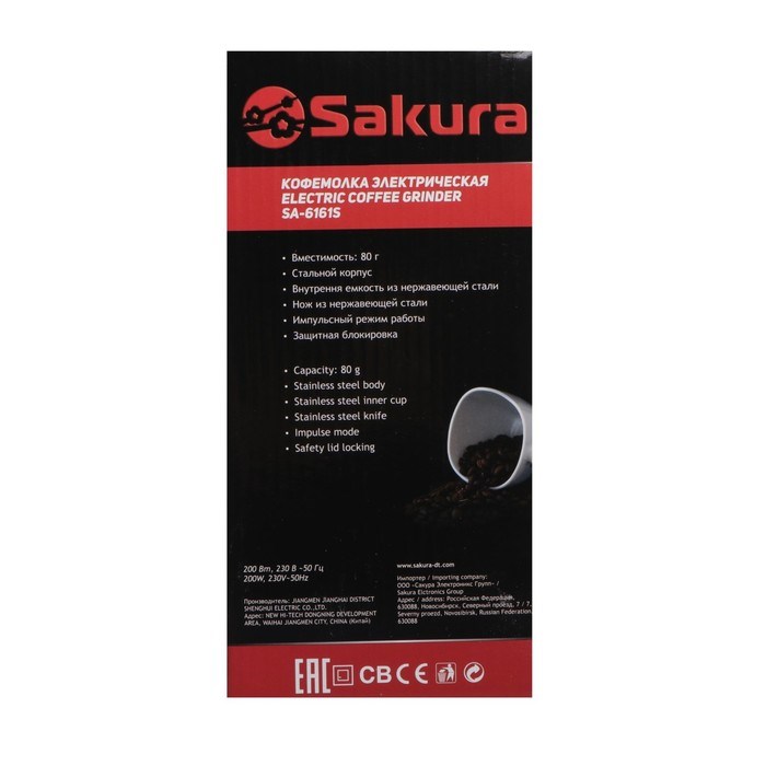 Кофемолка Sakura SA-6161S, электрическая, ножевая 200 Вт, 80 г, серебристо-чёрная