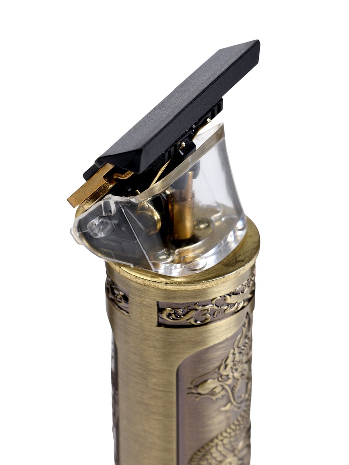 Портативная машинка для стрижки в бронзовом металлическом корпусе с аккумулятором на 600 мАч и зарядкой через USB оснащена дисплеем и индикатором заряда, где три насадки-гребни позволяют точно адаптировать стрижку под индивидуальные нужды, обеспечивая профессиональный результат в компактном виде с защитной крышкой для безопасного хранения.