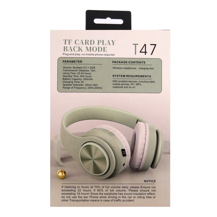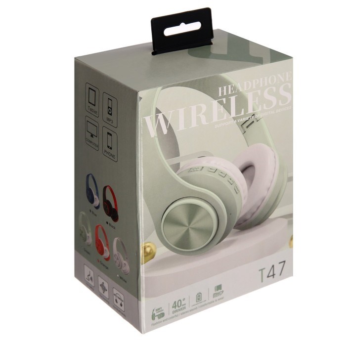 Наушники Т47, беспроводные, полноразмерные, BT, microSD, FM, микрофон, AUX, зеленые
