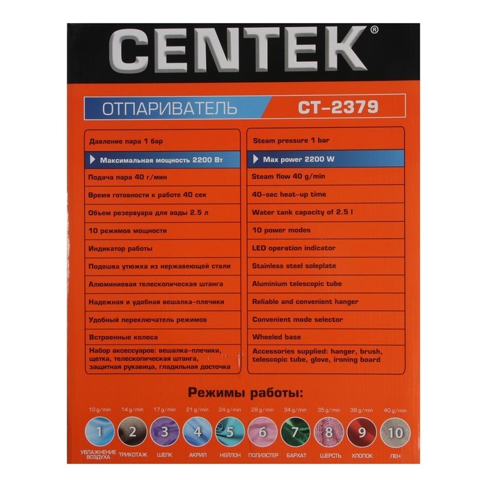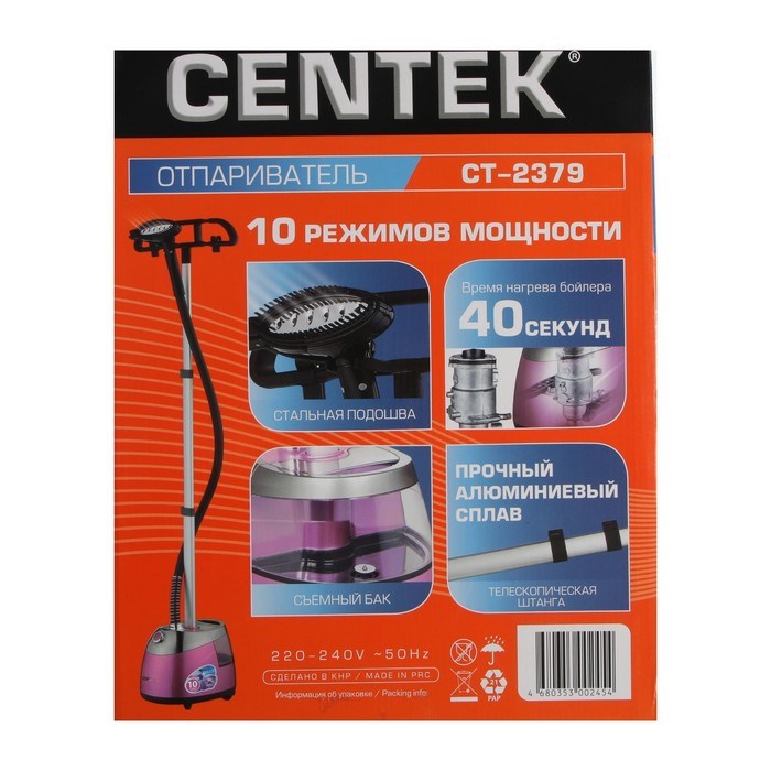 Прибор Centek предназначен для бережной глажки вещей. Удобная форма утюжка с большой площадью стальной подошвы экономит время — быстро нагревается, обеспечивая равномерную подачу пара.