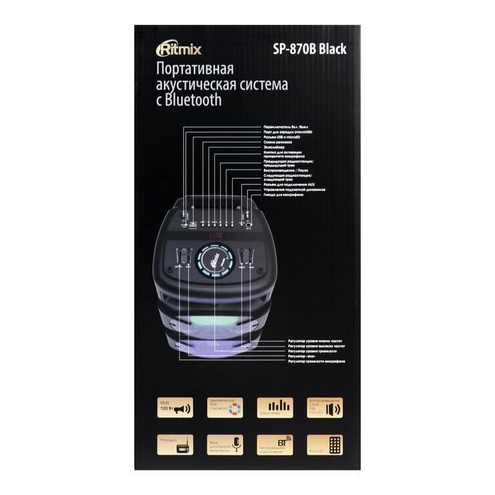 Портативная колонка Ritmix SP-870B, 120 Вт, Bluetooth, AUX, microSD, FM, 4400 мАч, чёрная