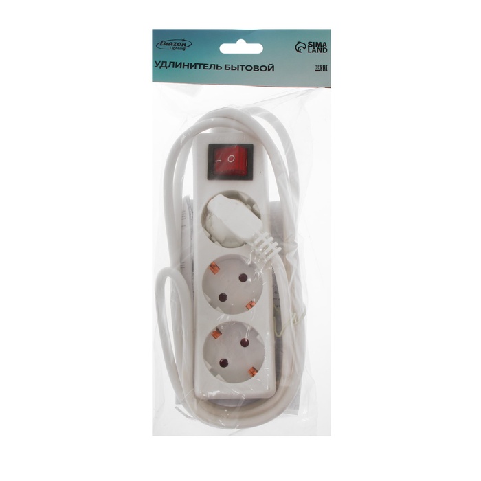 Удлинитель Luazon Lighting, 3 розетки, 1,8 м, 10 А, 1300 Вт, 3х0.75 мм2, с з/к, с выкл., Б