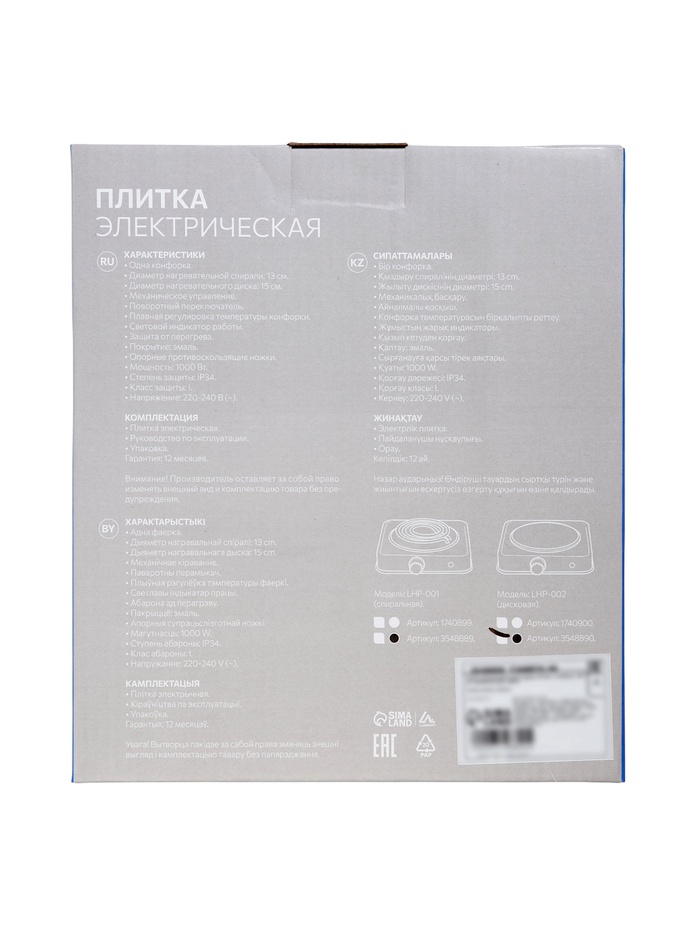 Плитка электрическая Luazon LHP-002, 1 конфорка, 1000 Вт, нагреватель диск, чёрная