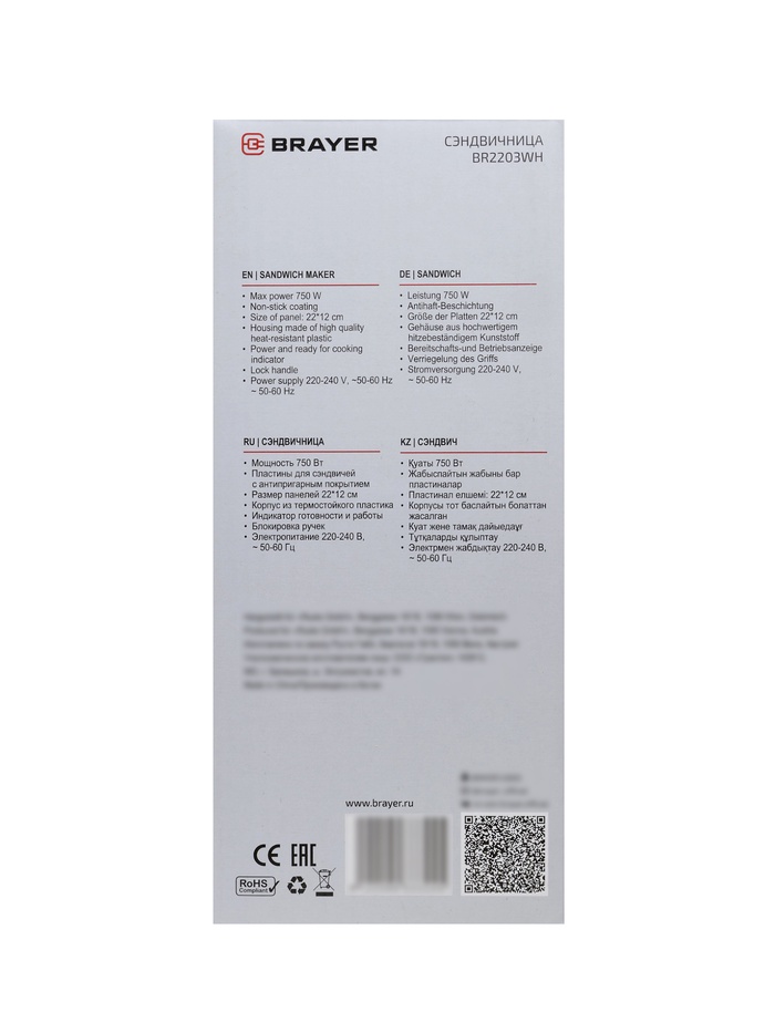 Сэндвичница BRAYER BR2203WH превращает приготовление горячих бутербродов в быстрый и приятный процесс. Благодаря мощности 750 Вт прибор равномерно и эффективно разогревает пластины, поддерживая нужную температуру для золотистой корочки и расплавленного наполнителя. Антипригарное покрытие пластин облегчает уход за устройством, а индикатор подсказывает, когда можно начинать готовку.
